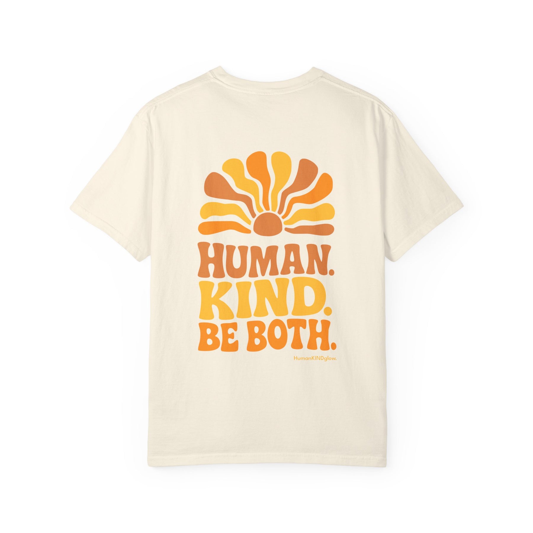Warm, simple, and quietly bold — this garment-dyed tee carries a sunny, retro-inspired statement that reads like a gentle reminder. The soft, lived-in cotton feels broken-in from day one, while the warm orange and gold print—small on the chest, larger on the back—echoes a vintage sunburst and the message: HUMAN. KIND. BE BOTH. Wear it on slow mornings, neighborhood walks, or community meet-ups; it settles into your rotation and starts conversations without shouting. The relaxed cut and medium-weight fabric drape casually, letting the message lead while keeping comfort front and center.