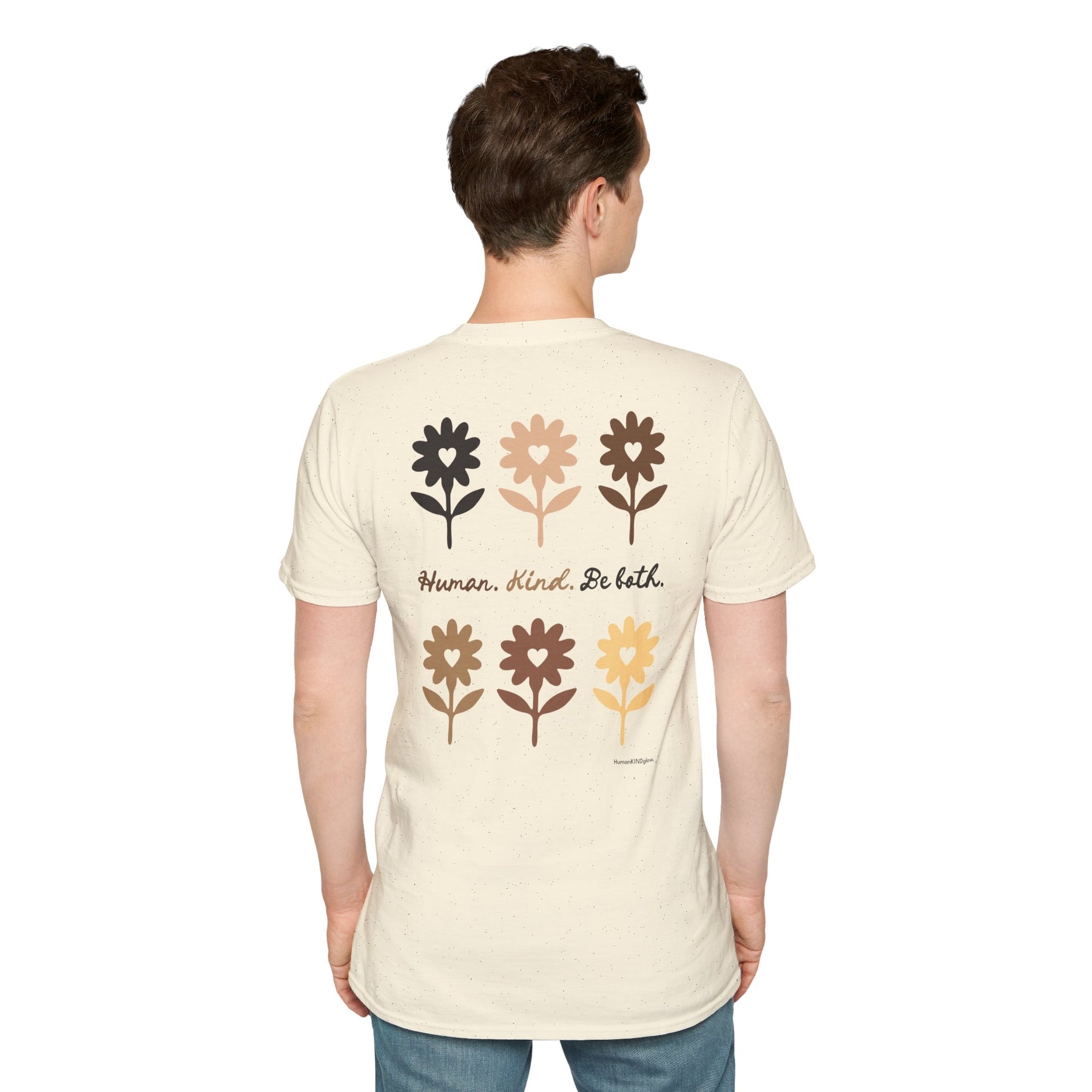 e front shows a small, hand-drawn flower and the words “You are loved” near the heart. The back blooms with a grid of warm-toned flowers and the handwritten line “Human. Kind. Be both.” It’s breathable and smooth against skin, draping casually without stiffness. Wear it when you want to carry a quiet message of compassion—layer it, lounge in it, or bring it to community gatherings where warmth and connection matter.